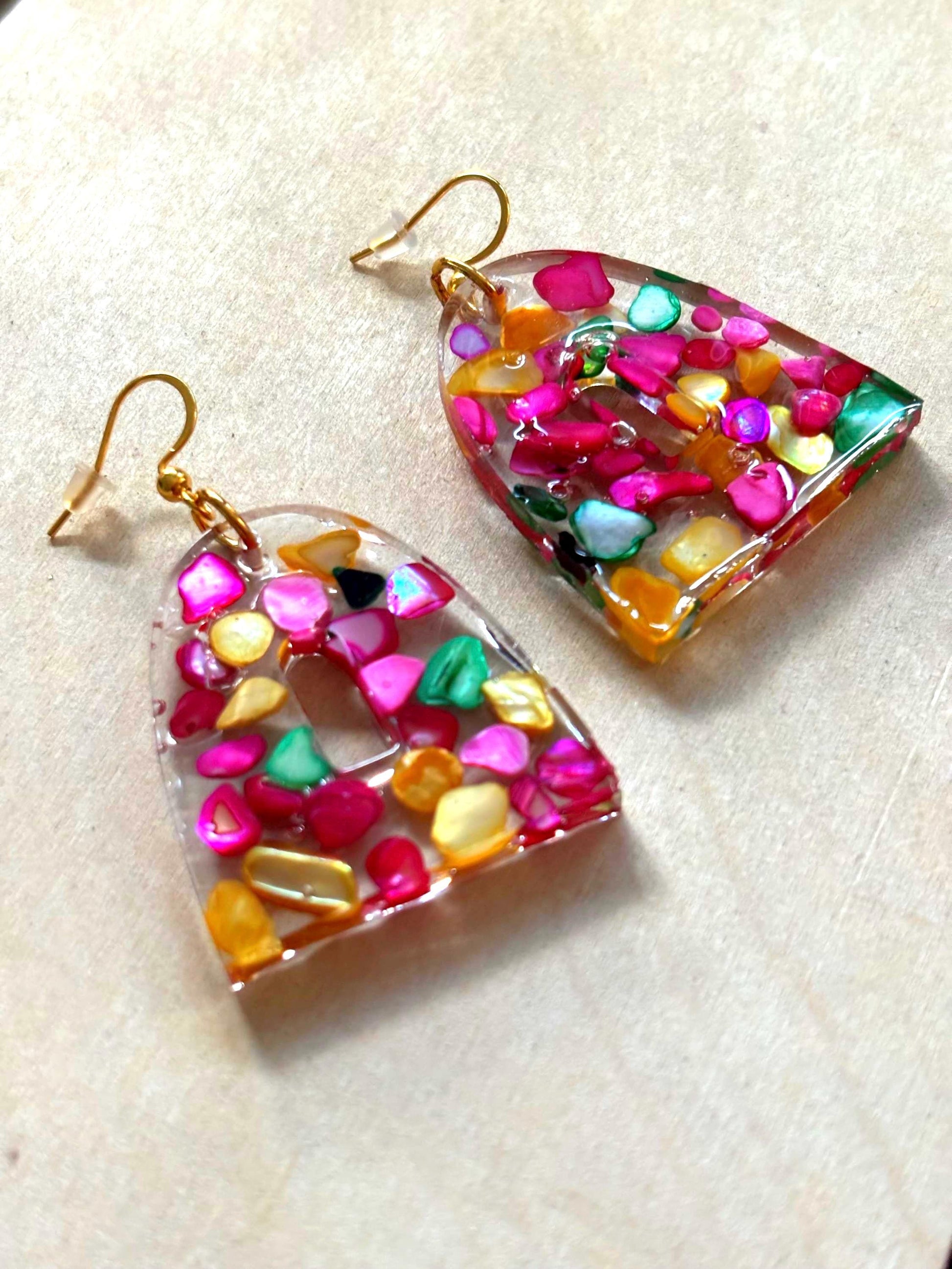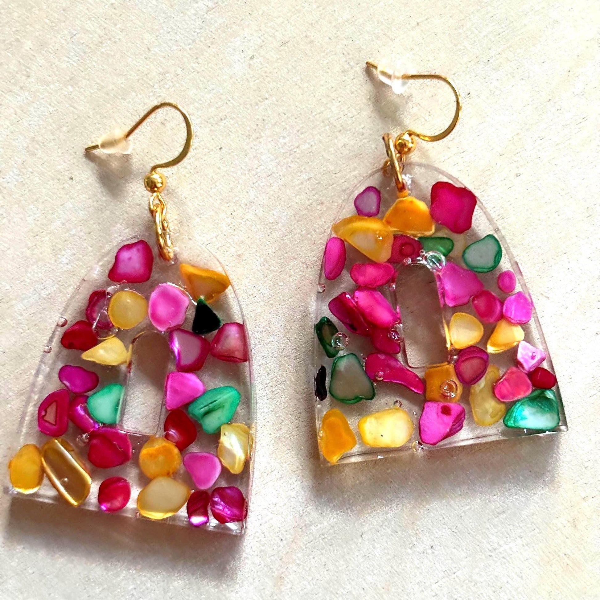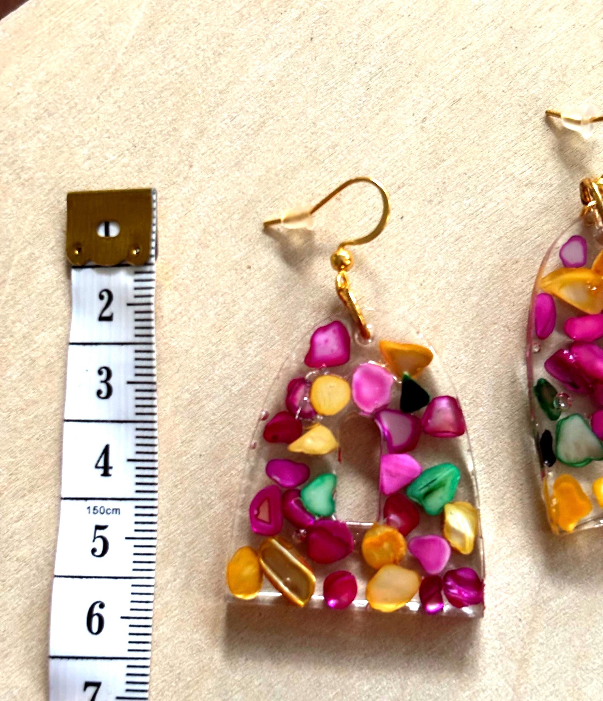 Ces boucles d'oreilles sont fabriquées en résine avec des fragments de coquillages colorés. Les crochets d'oreilles sont en acier inoxydable et hypoallergéniques.