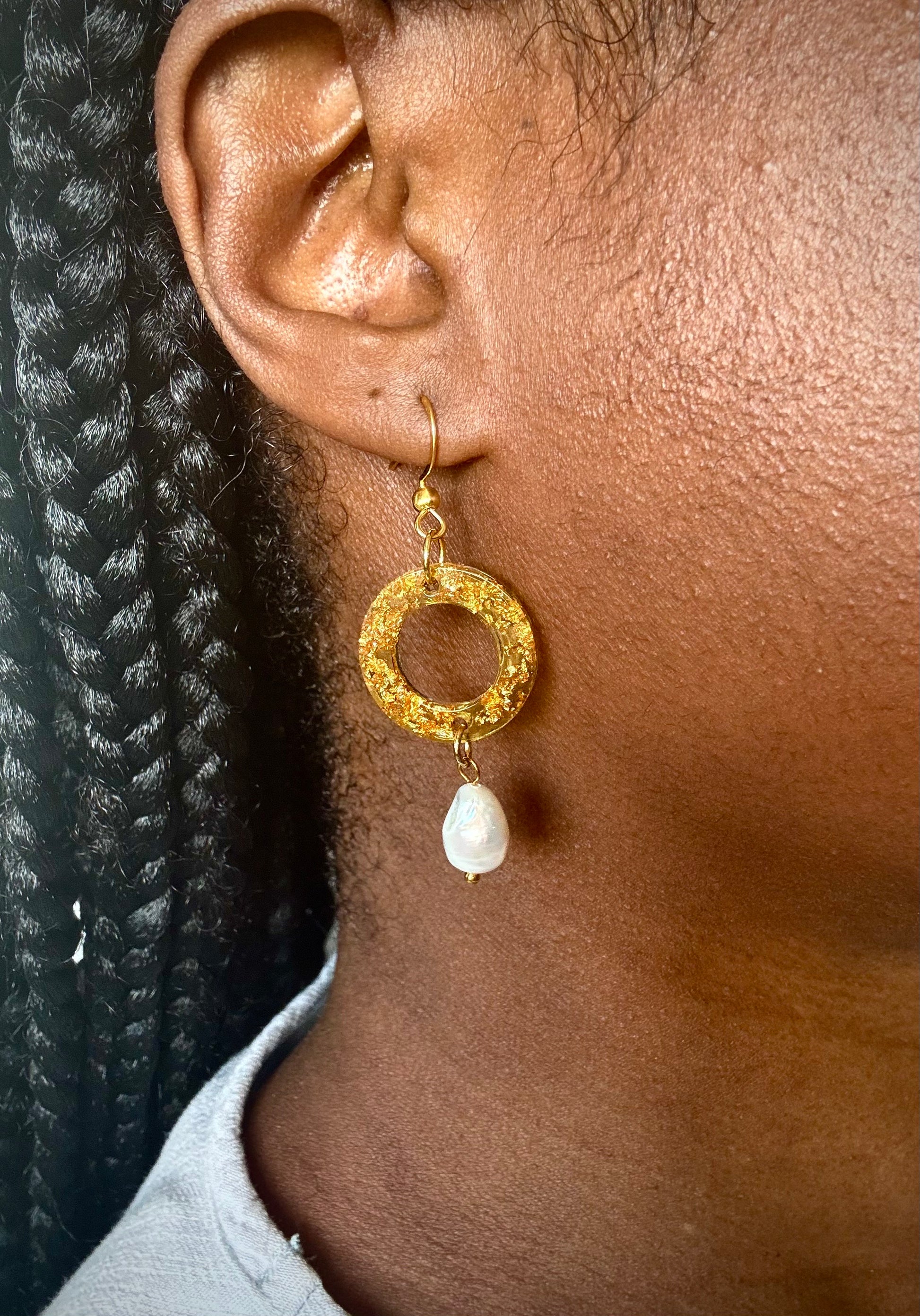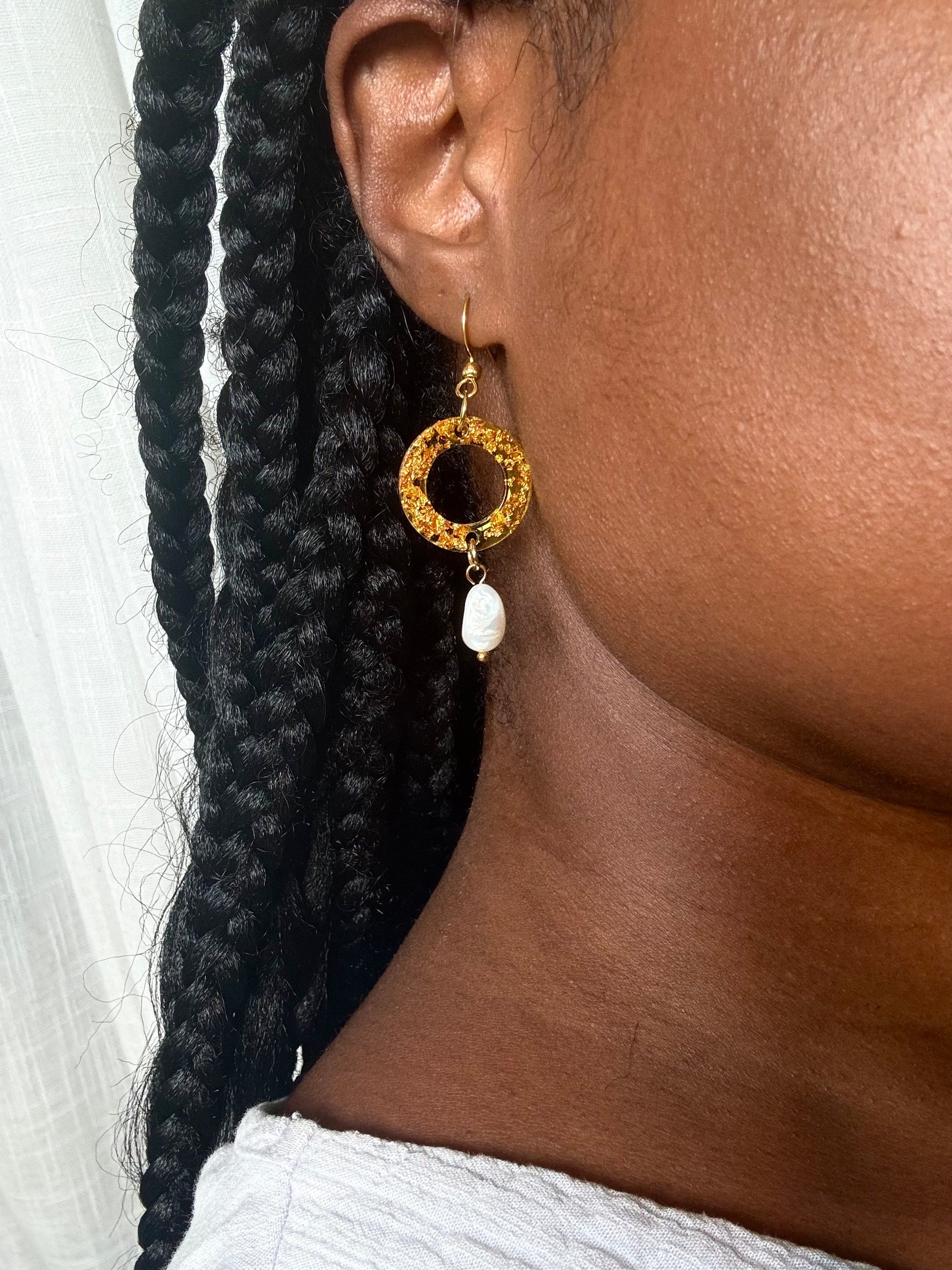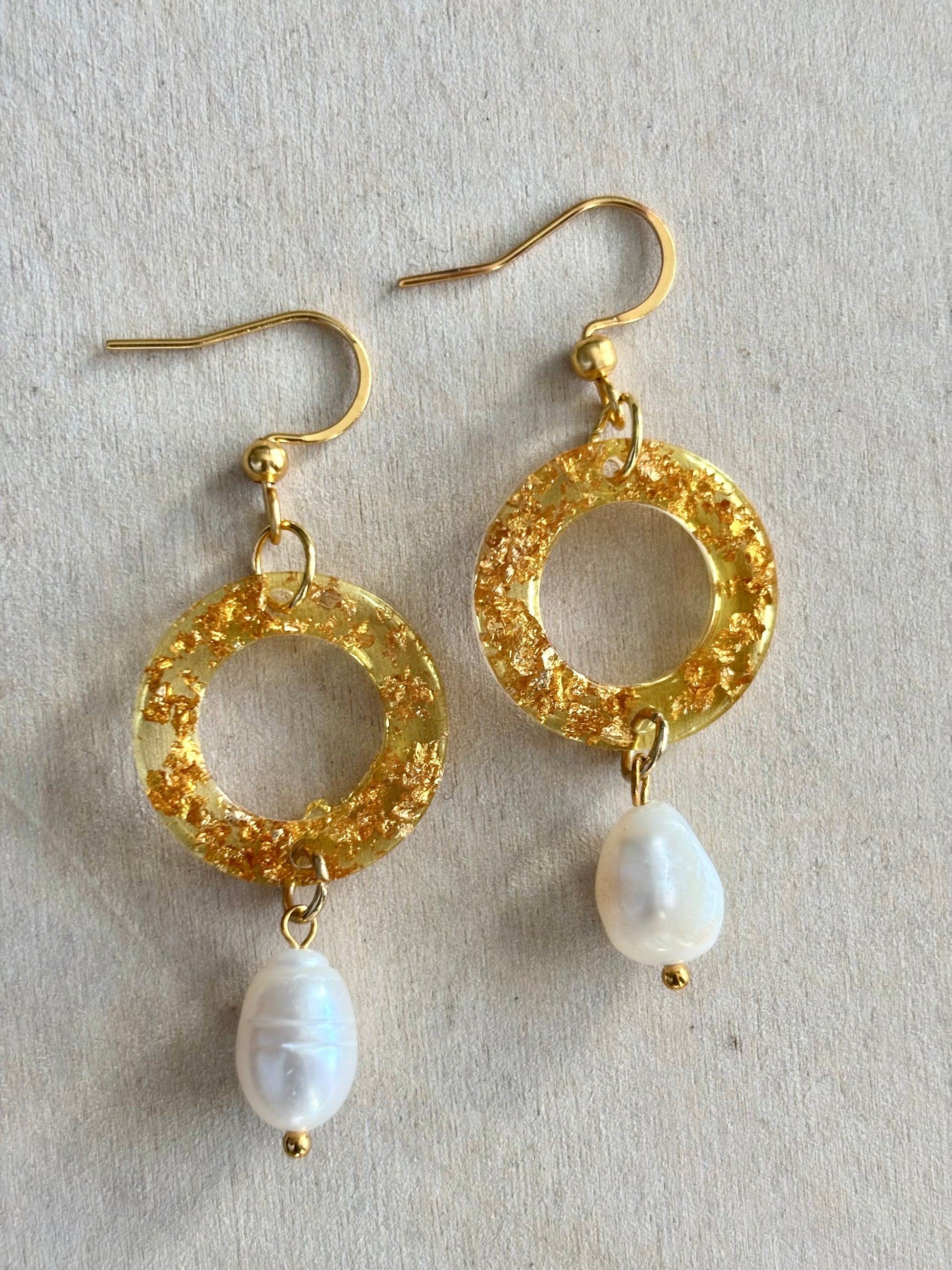 One pair of elegant resin earrings with a drop of golden pigment and golden flakes. With fresh water pearl. The earring hooks are stainless steel, hypoallergenic and tarnish resistant.