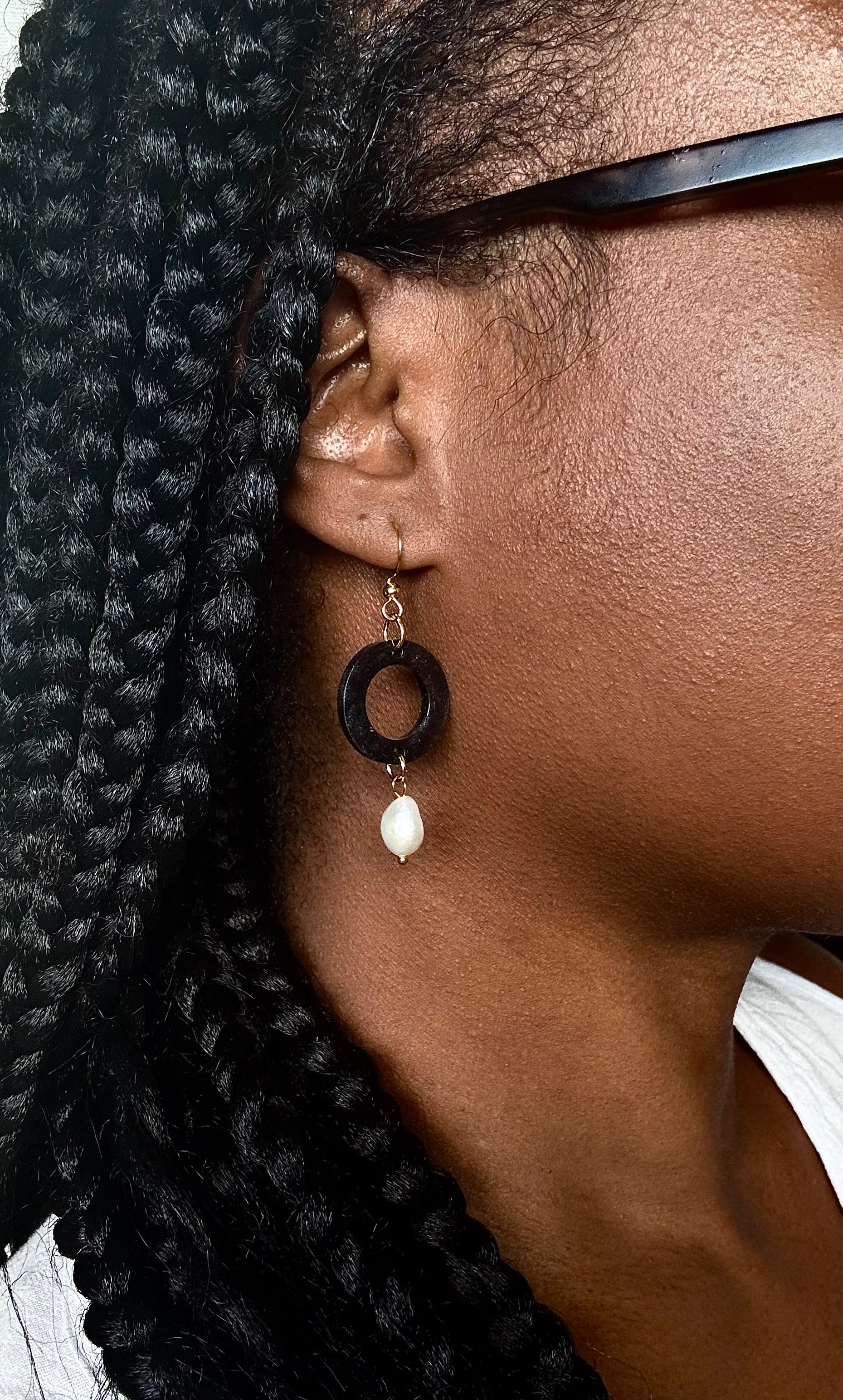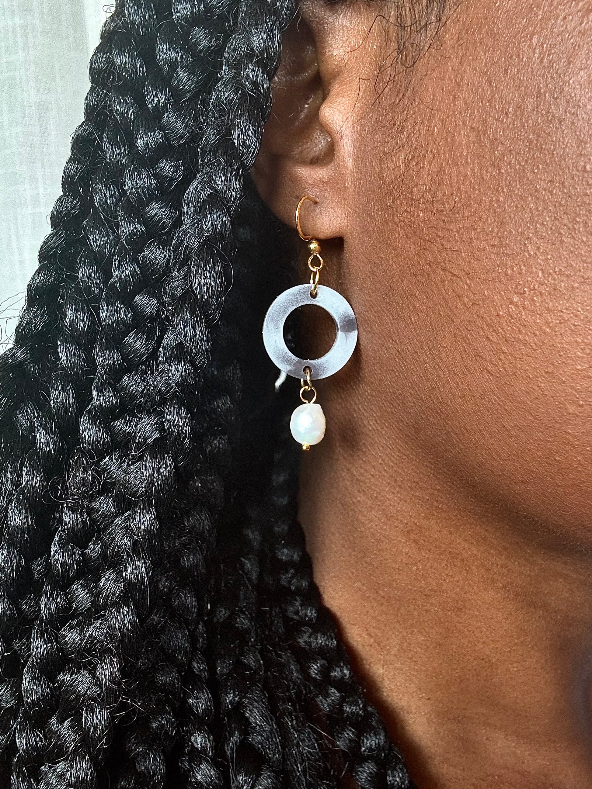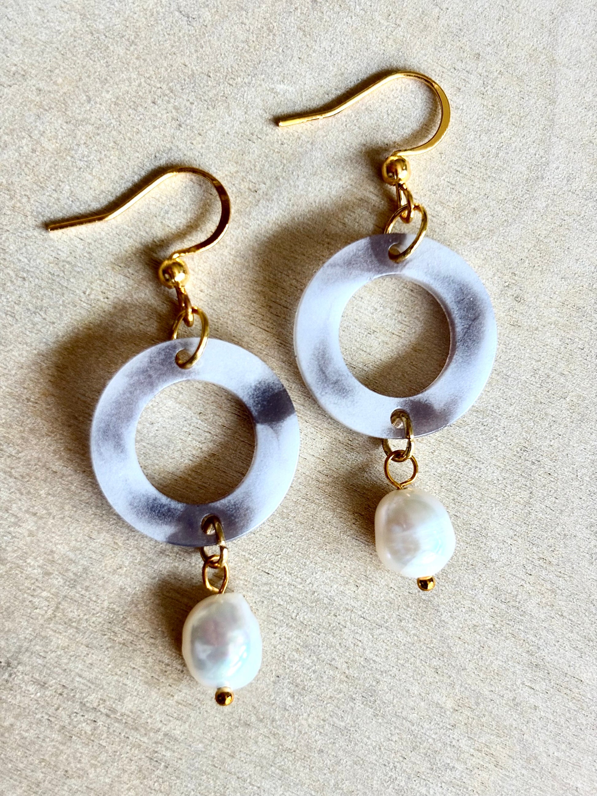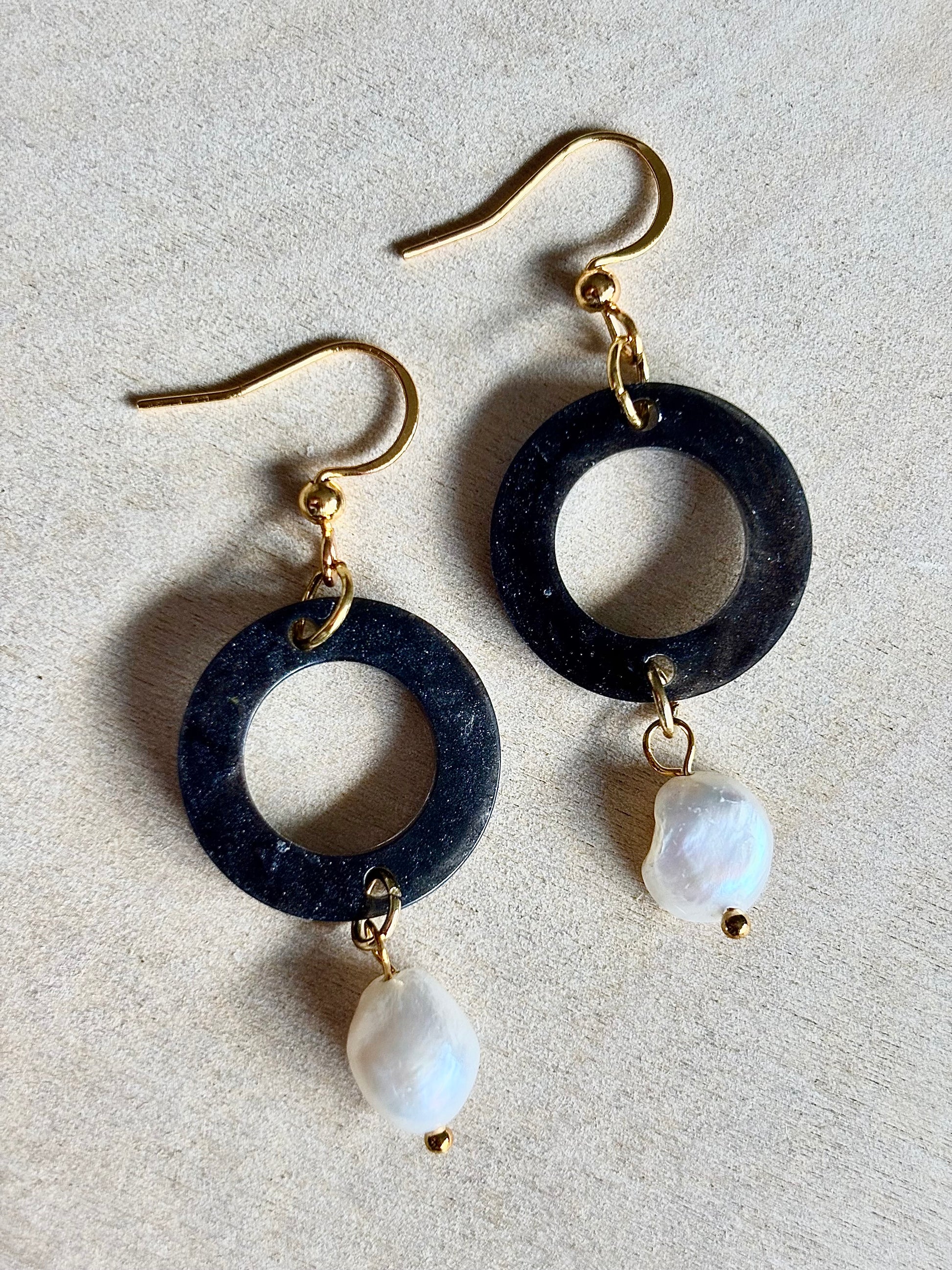 One pair of elegant resin earrings with a drop of golden pigment and golden flakes. With fresh water pearl. The earring hooks are stainless steel, hypoallergenic and tarnish resistant.