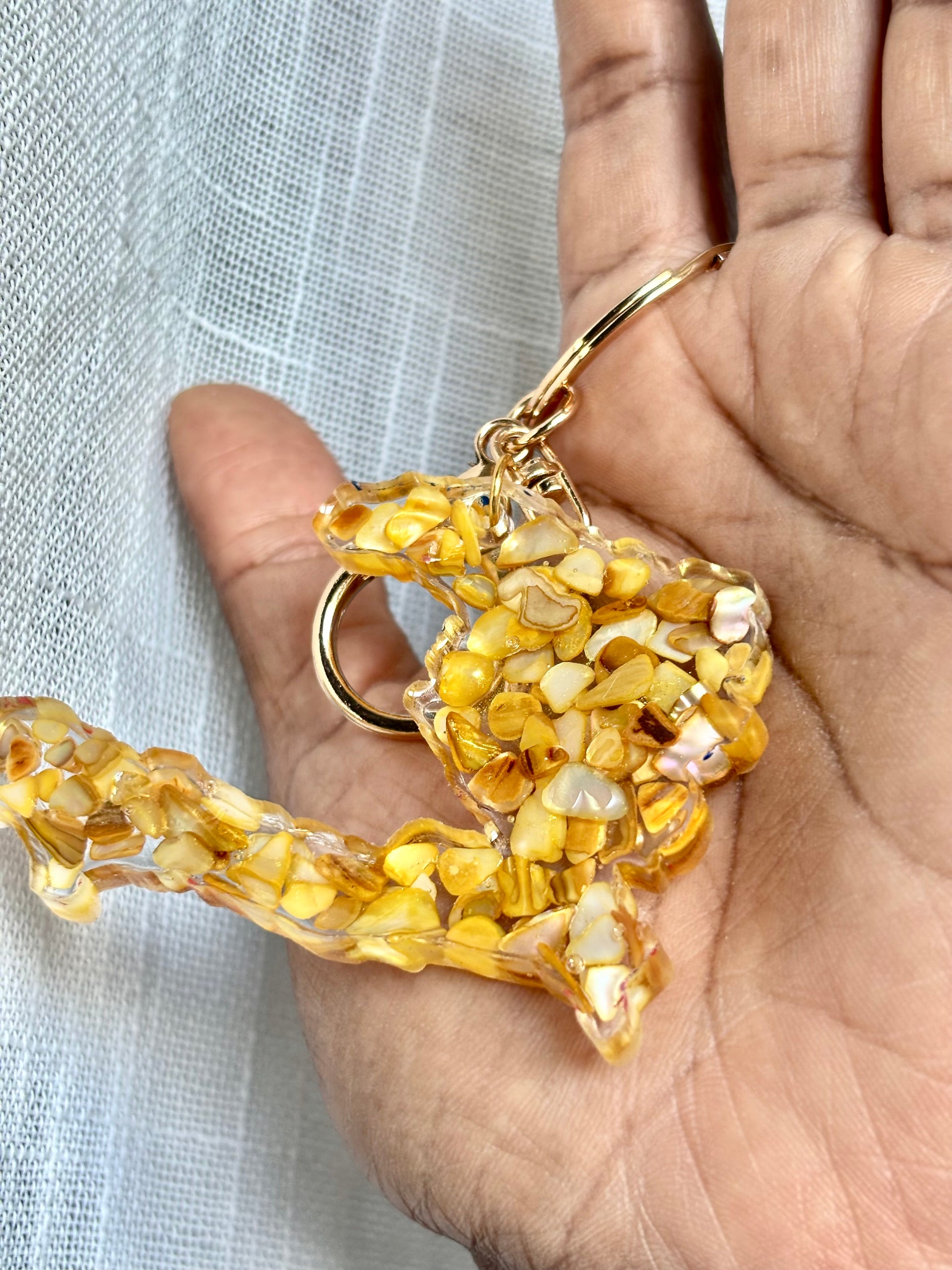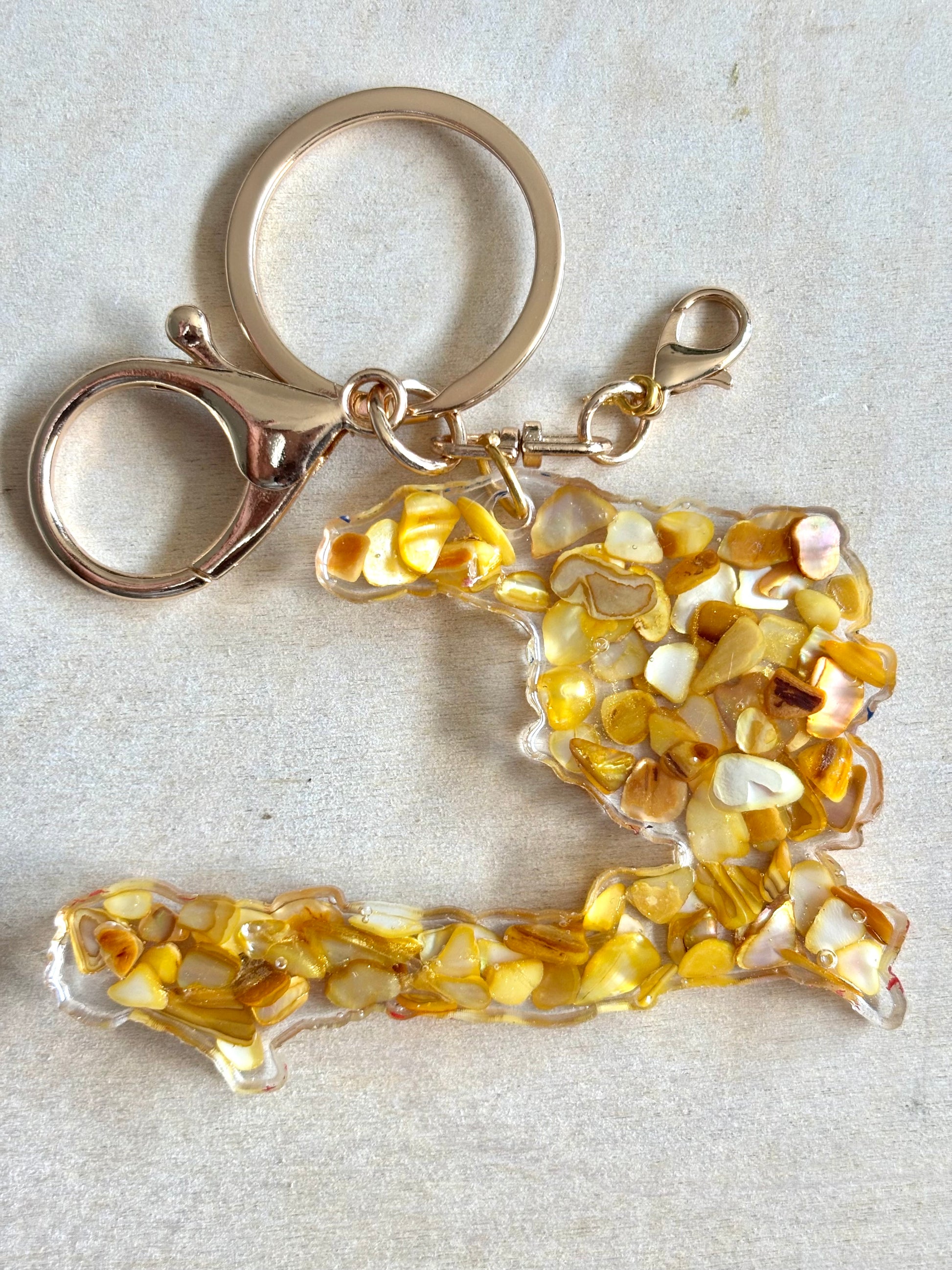 Map of Haiti made with tinted stones and covered with resin. This beautiful keychain can be used for key sets, to dress-up a bag or hang on the interior car mirror.