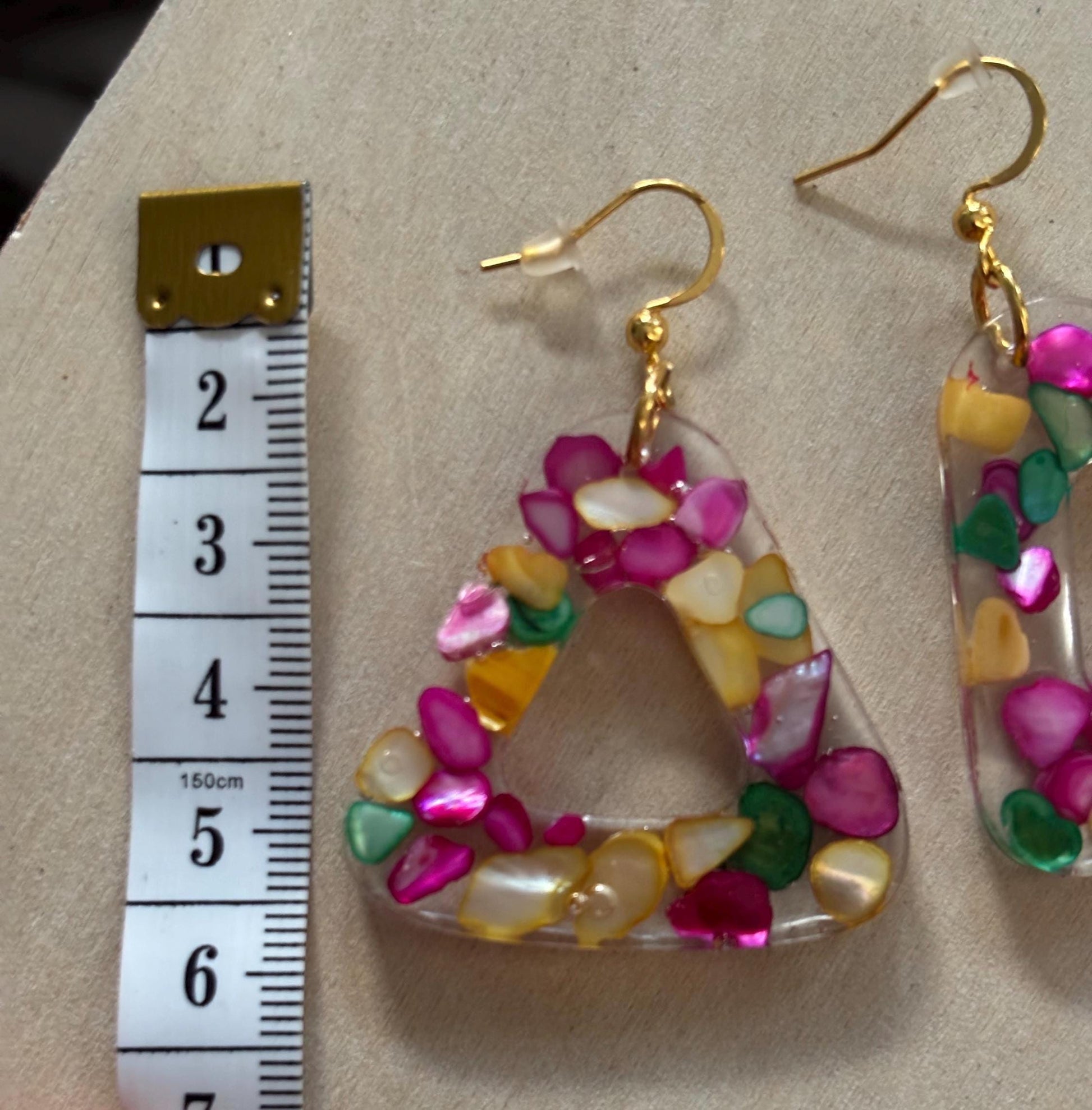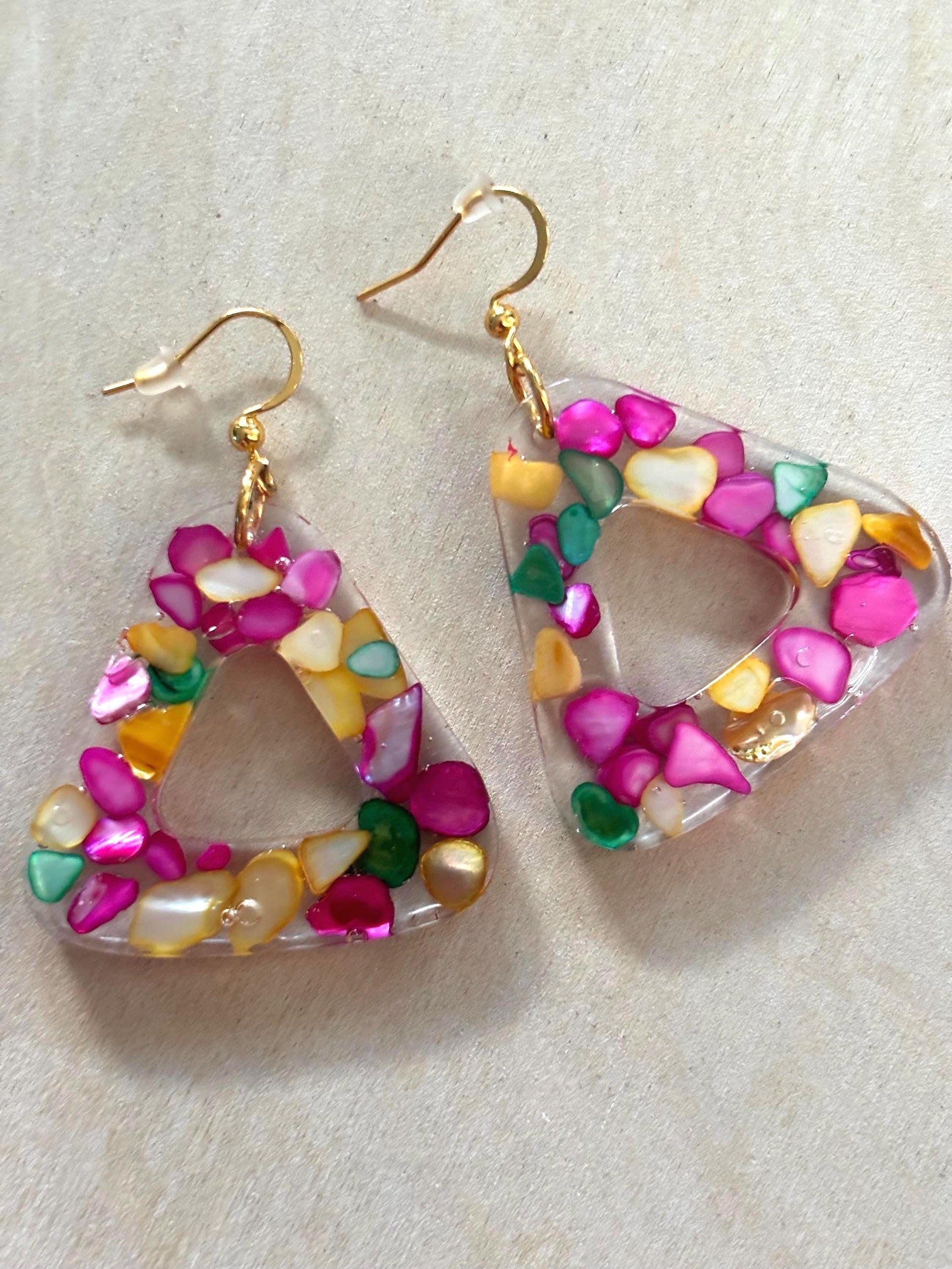 These earrings are made of resin with fragments of colorful shells. The ear hooks are stainless steel and hypoallergenic.