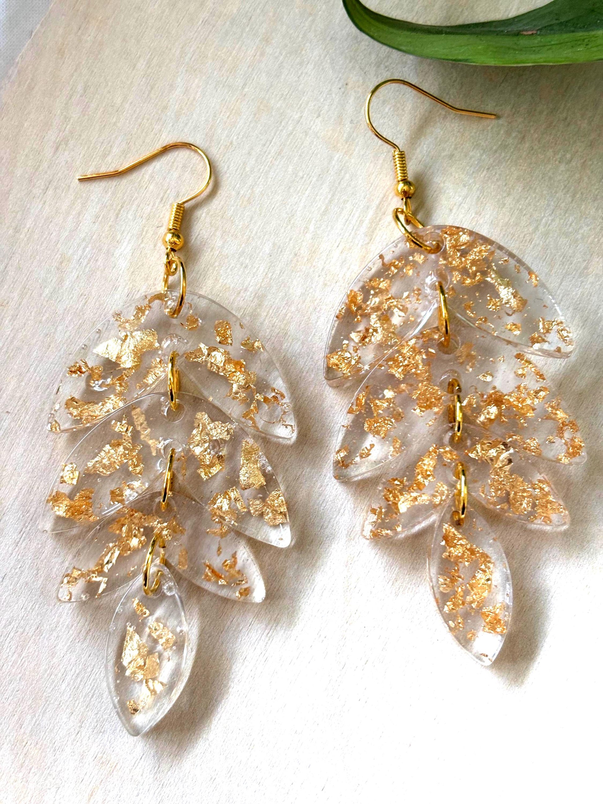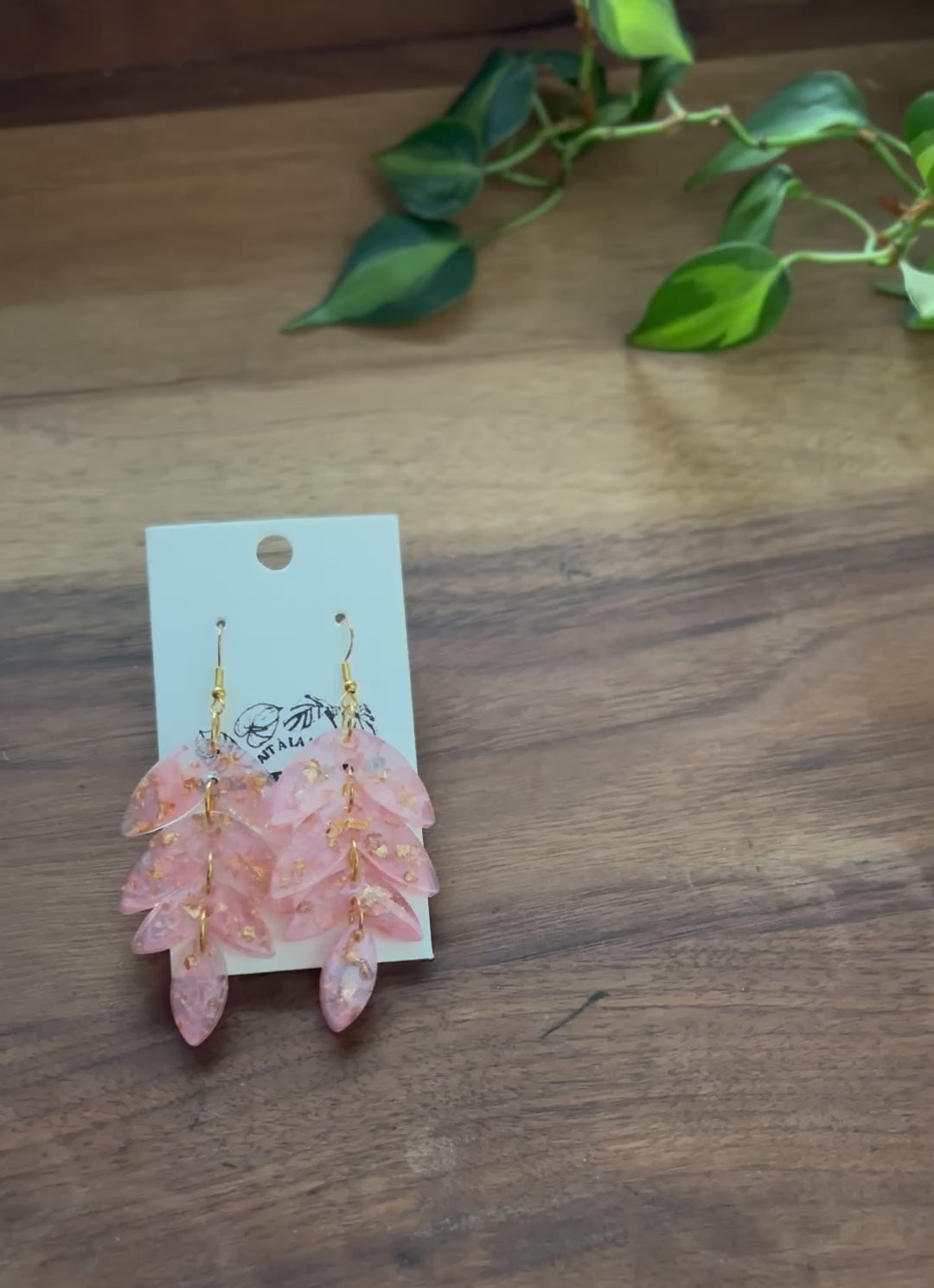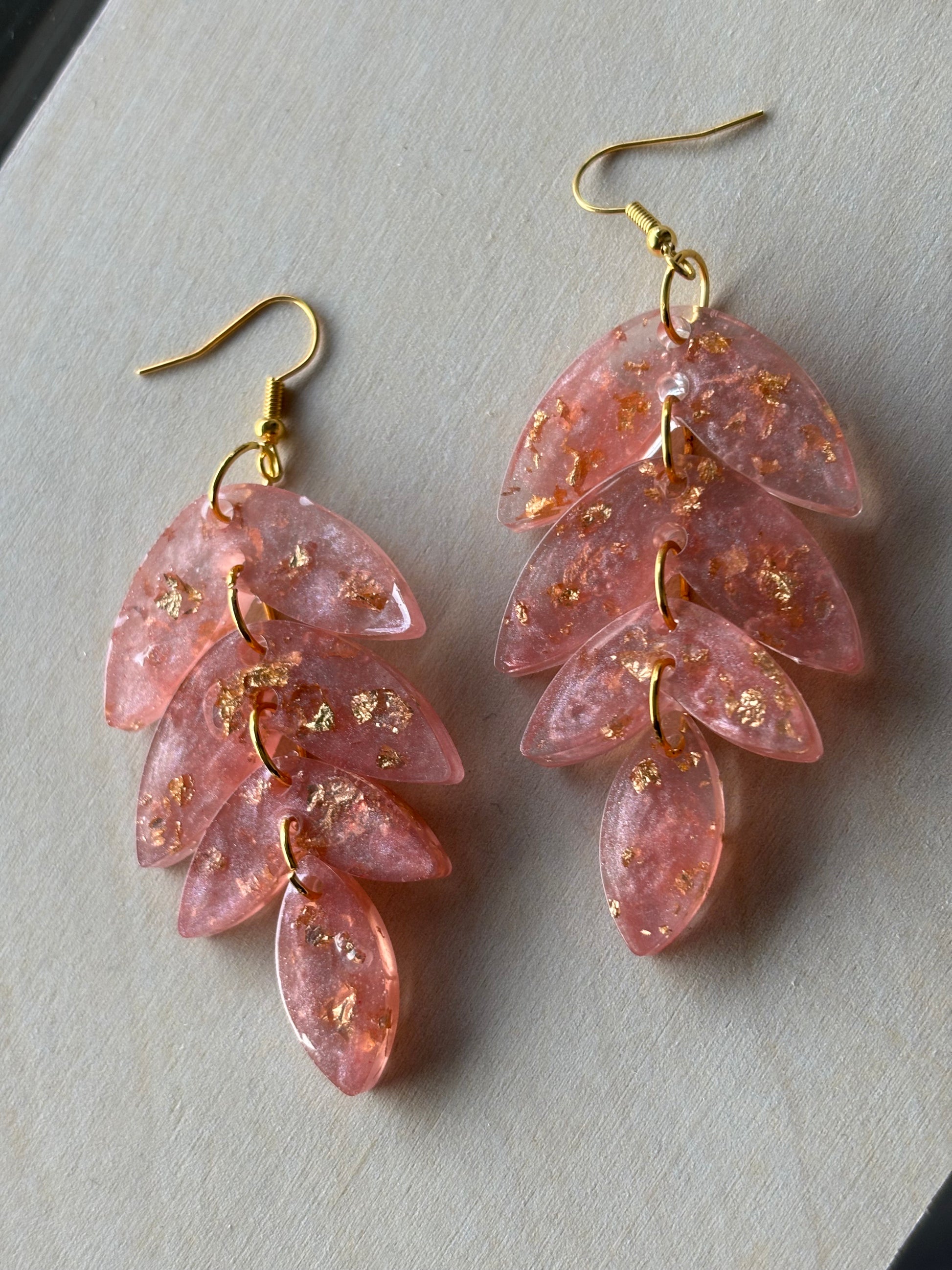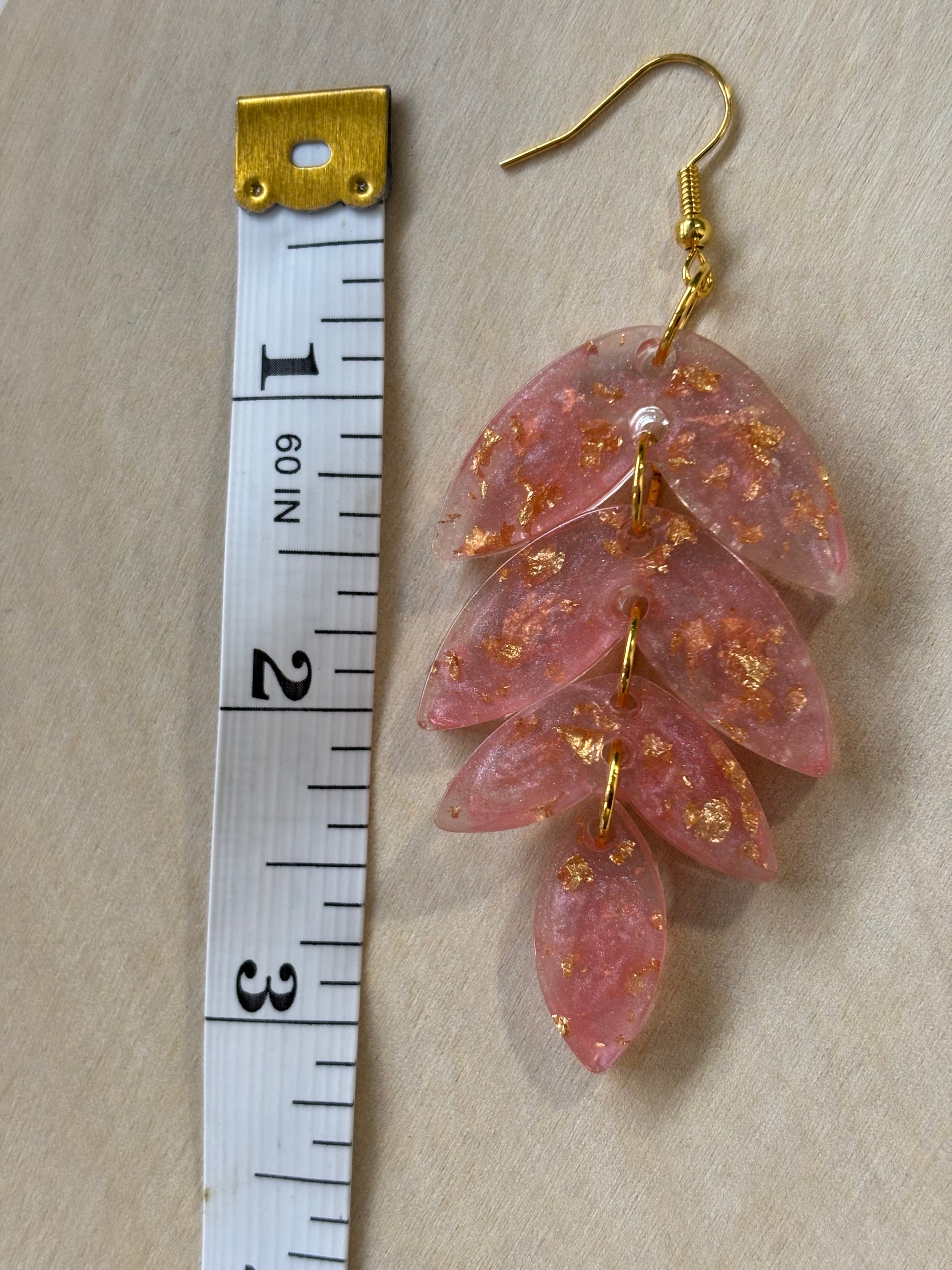 These earrings are made of resin with golden foil flakes. The ear hooks are stainless steel and hypoallergenic. Fairly light weight and ideal for all occasions! Comes in two colors: clear or pink.