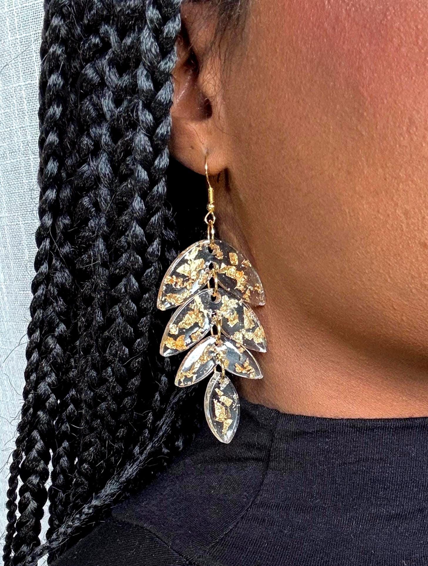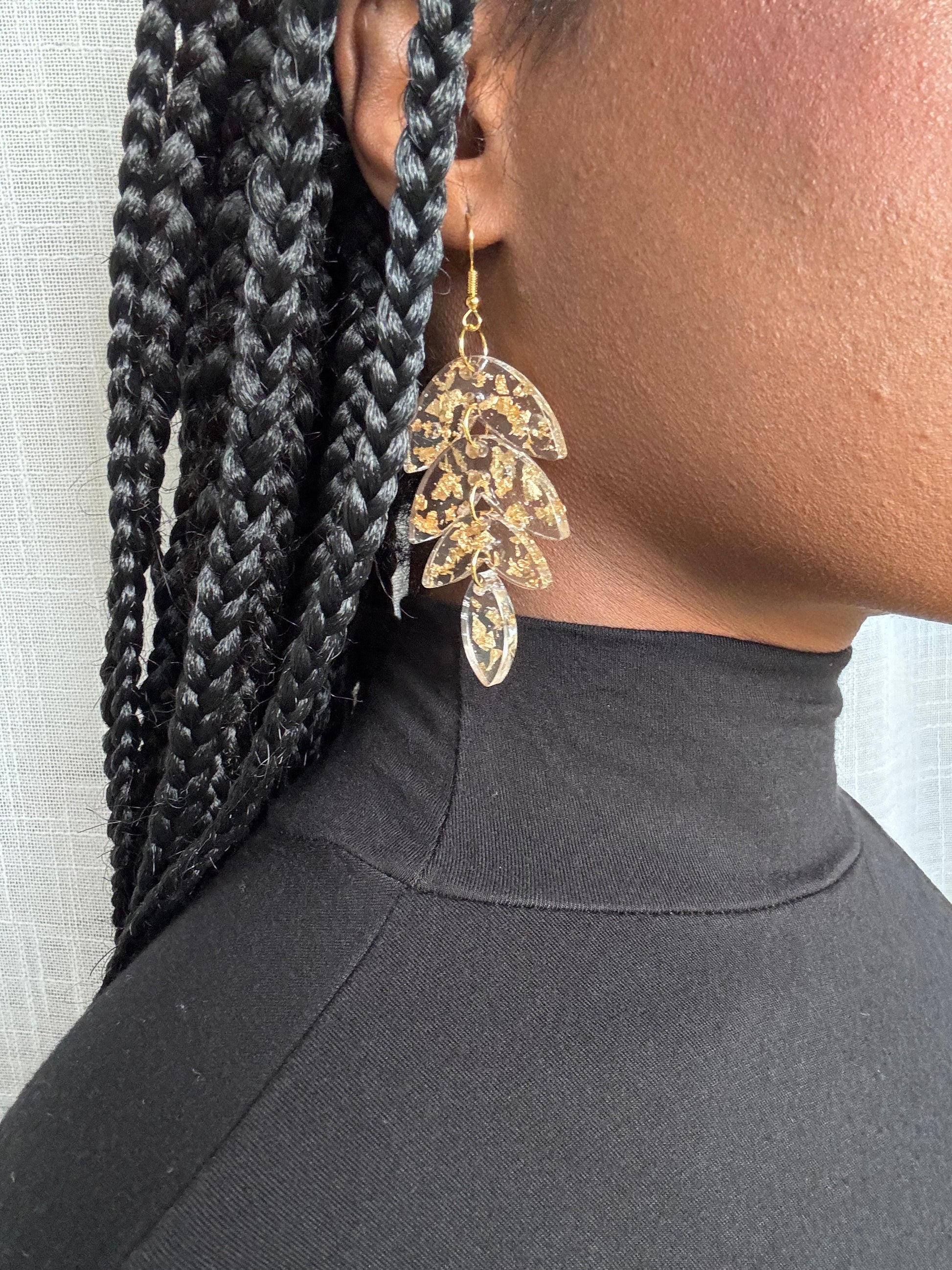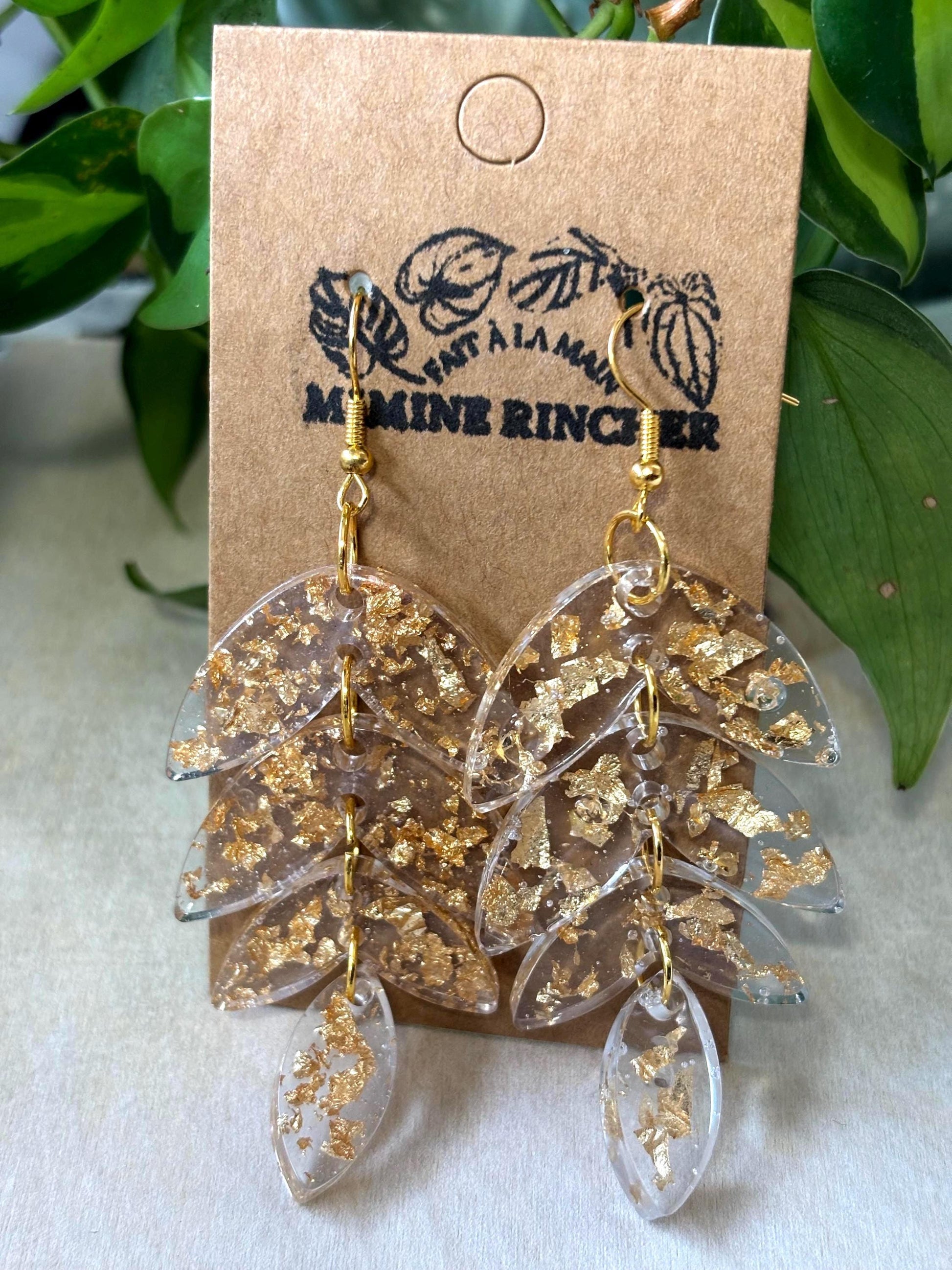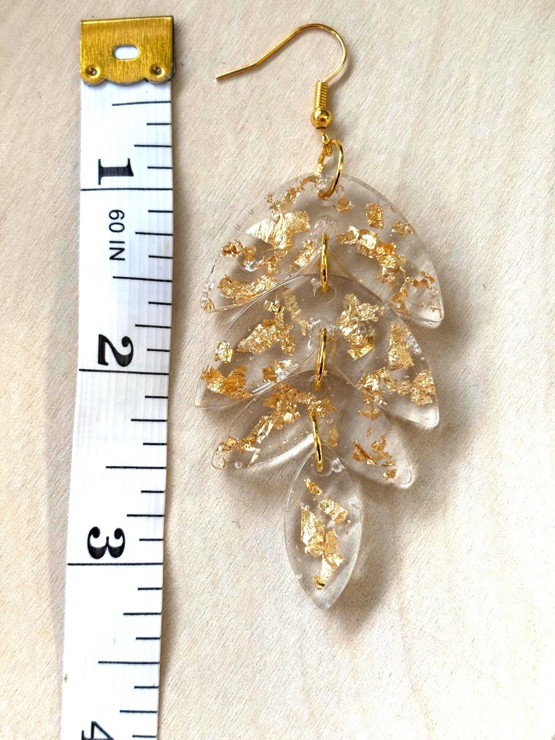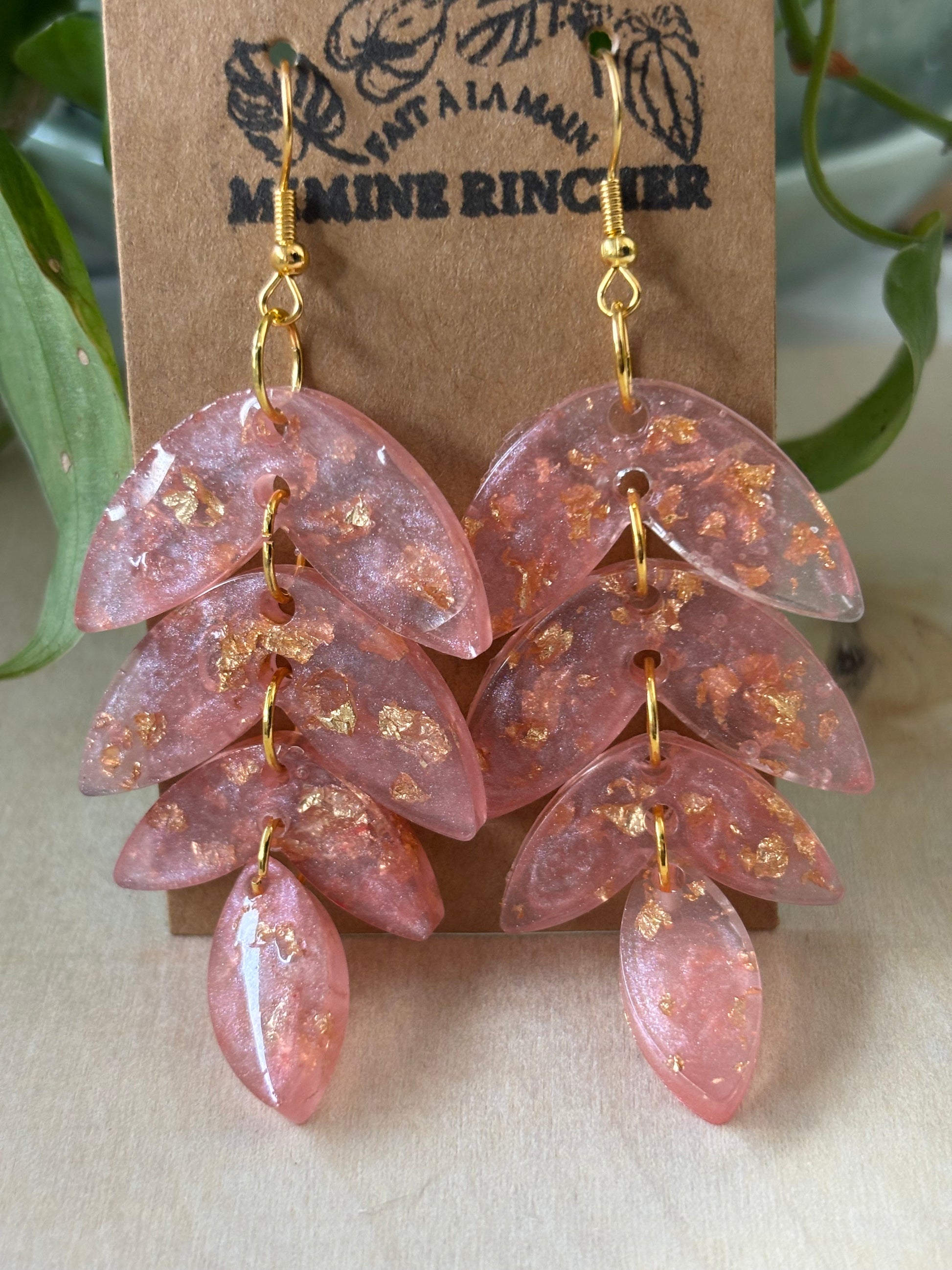 These earrings are made of resin with golden foil flakes. The ear hooks are stainless steel and hypoallergenic. Fairly light weight and ideal for all occasions! Comes in two colors: clear or pink.